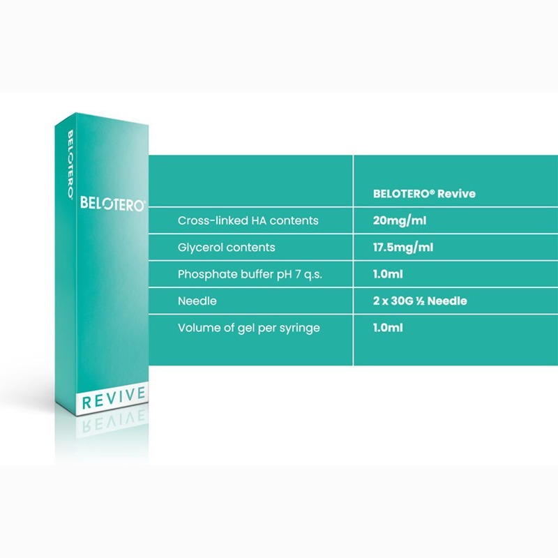 Belotero® Revive includes 20 mg/ml of sodium hyaluronate and 17.5 mg/ml of glycerin.