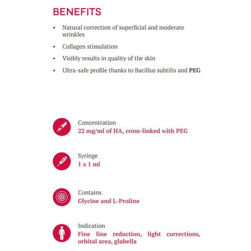 A: It’s ideal for light wrinkle correction, particularly in the forehead, glabella, crow’s feet, nasolabial folds, perioral areas, and for lip volume and contouring.