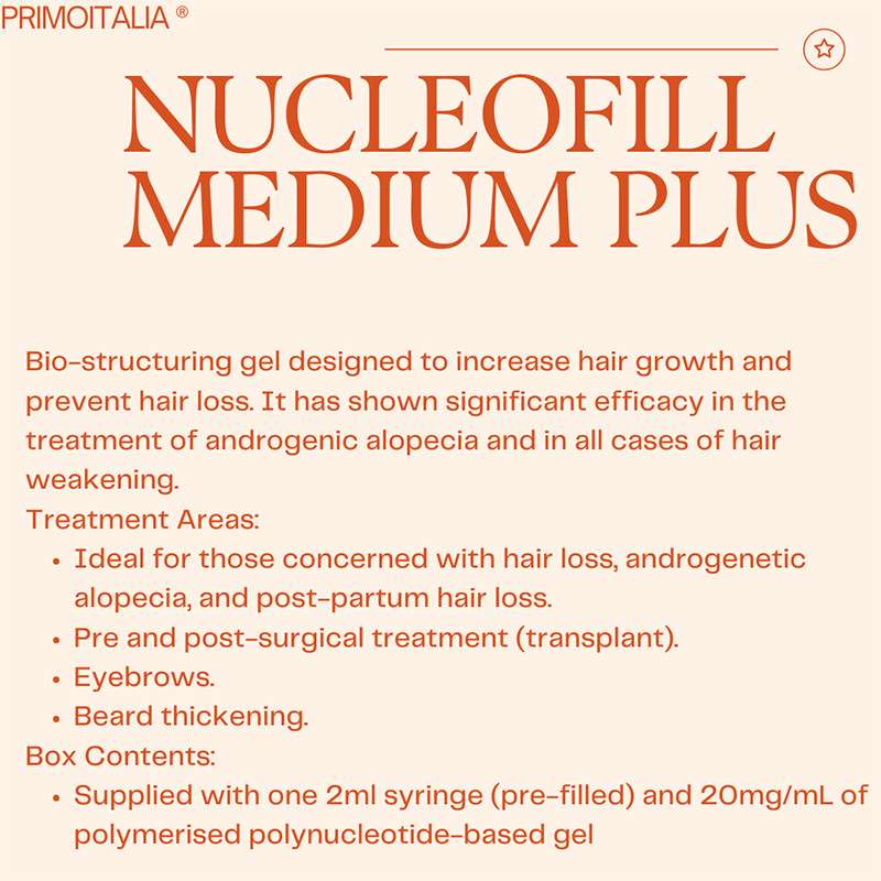 Transform your skincare routine with Nucleofill Hair (Medium Plus), an advanced dermal revitaliser developed by Promoitalia Medical Aesthetics. Infused with a powerful blend of polynucleotides, this innovative treatment is specifically designed to target the hair and scalp, offering a comprehensive solution for hair loss. Ideal for rejuvenation, Nucleofill Hair (Medium Plus) promotes deep skin regeneration while effectively combating oxidative stress, delivering exceptional results.