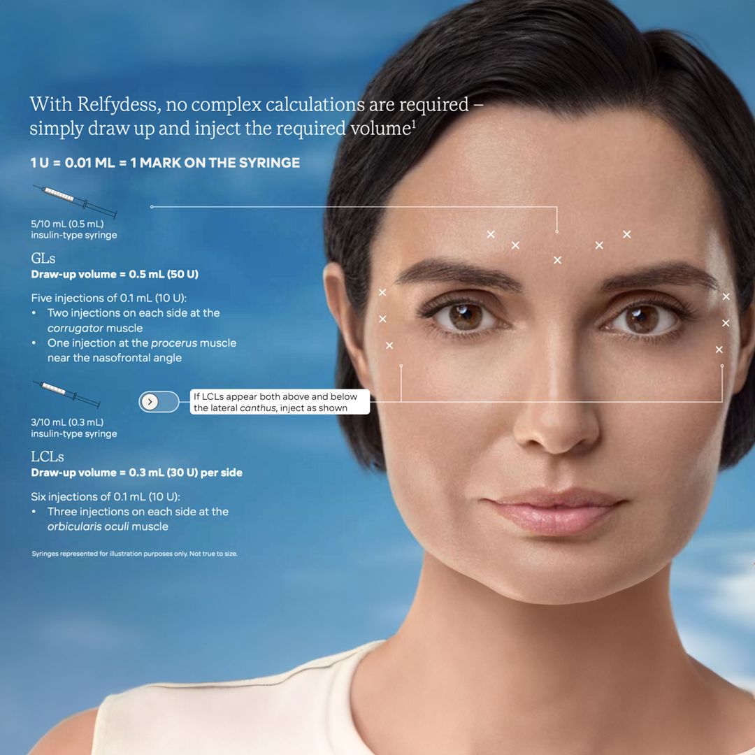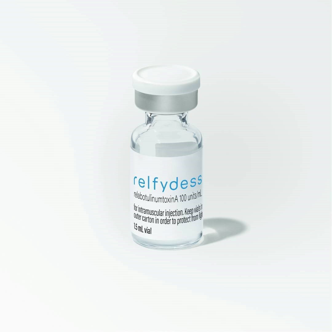Relfydess 100U Vials contain botulinum toxin type A, a prescription medicine used in aesthetic and therapeutic treatments. When carefully injected by a trained healthcare professional, it works by temporarily relaxing targeted muscles. In aesthetics, this helps to soften the appearance of fine lines and wrinkles, creating a smoother and more refreshed look. The product is supplied as a freeze-dried powder in a 100-unit vial, which is reconstituted before use to ensure precise dosing. Treatments with botulinum toxin are quick, minimally invasive, and results typically last for several months. It is an effective and trusted option for patients seeking subtle rejuvenation and facial balancing as part of their personalized aesthetics plan.