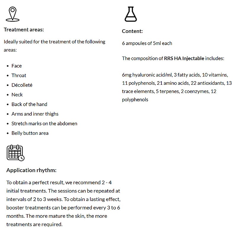 5Q: Can RRS HA Injectable be used for facial and body skin rejuvenation? A: Yes, RRS HA Injectable is suitable for various injection techniques, making it a versatile treatment for facial, neck, décolleté, and body skin.